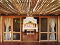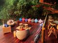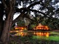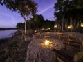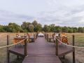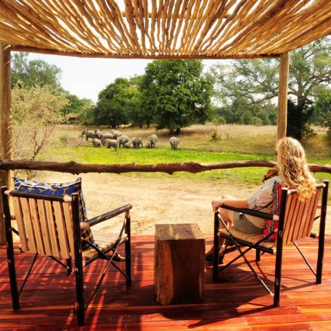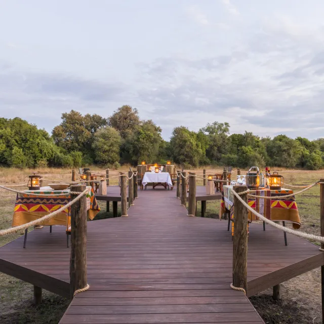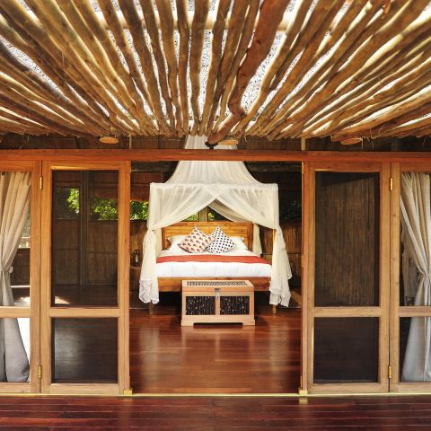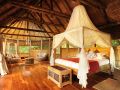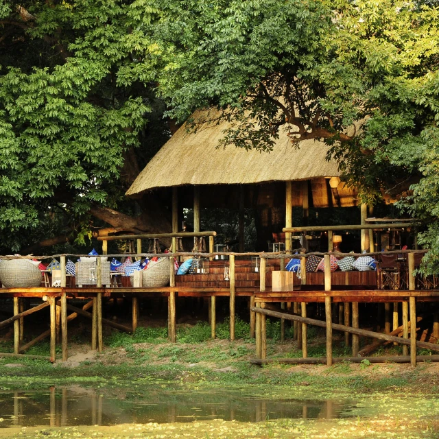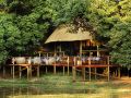 The camp has four authentic thatched chalets, on raised wooden decks overlooking the lagoon. Rich wooden interiors replicate the surrounding forest with bright splashes of colour throughout. The lounge and dining area is built around a large termite mound beneath a mahogany tree providing ample shade during the heat of the day.