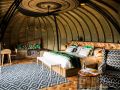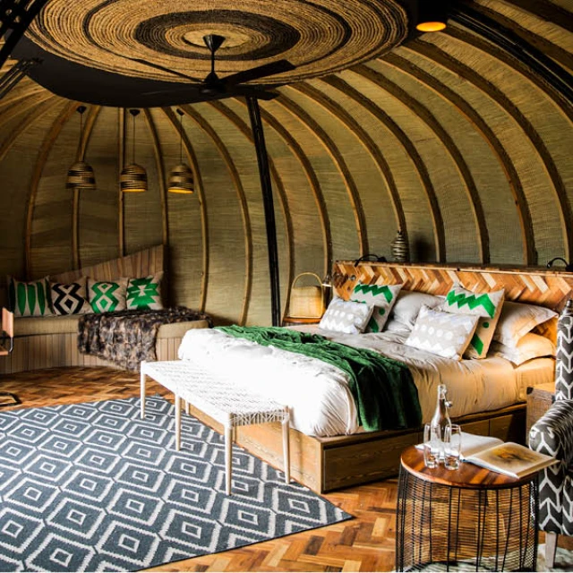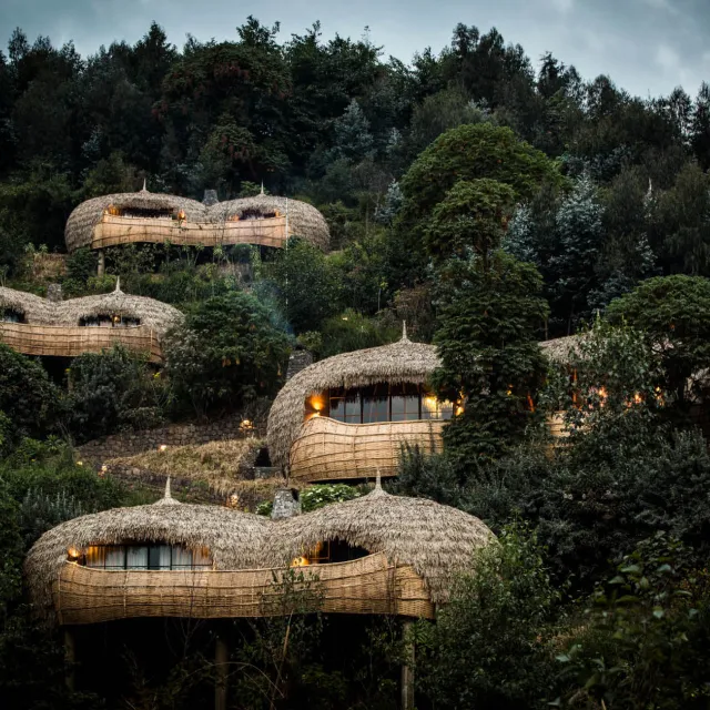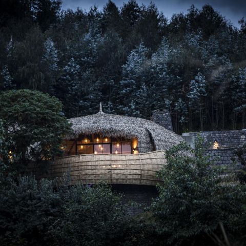 Six opulent en-suite forest villas are warmed by a central fireplace and have breathtaking views from the deck. The main area comprises a lounge, dining and bar area, wine cellar and viewing deck. Both the architecture and interiors are rooted in Rwandan cultural traditions.