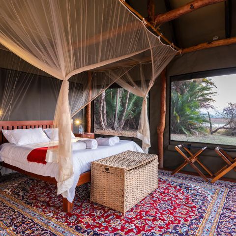 With just four en-suite luxury tents, the camp offers an intimate and immersive safari experience. Each tent opens onto sweeping views of the plains, where lechwe and wildebeest move in rhythm with the shifting seasons.