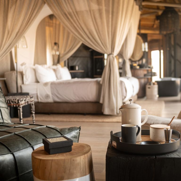 Four luxuriously spacious suites are placed around a thriving waterhole, connected by raised wooden walkways allowing wildlife to pass beneath undisturbed. Camp Kala exudes luxury and sophistication.