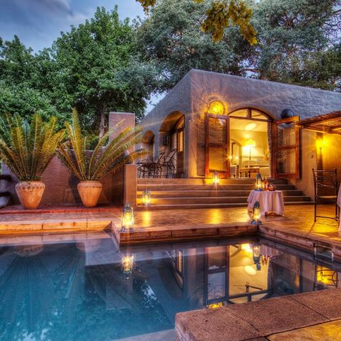 Each of Chobe Game Lodge's four luxury suites has an individual plunge pool set on a private terrace with breathtaking panoramic views of the endless landscape and open plains. Graceful high arches, quarry tiled floors and barrel vaulted ceilings create an atmosphere of cool tranquillity.