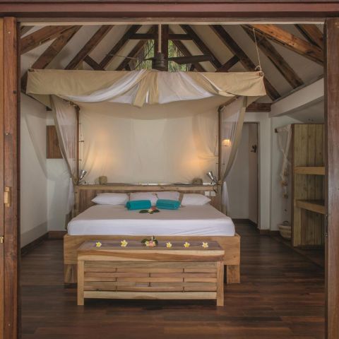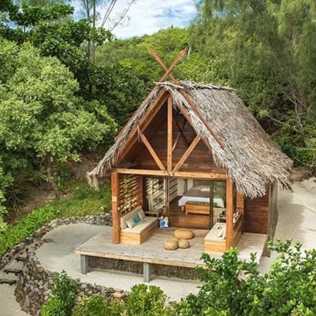 Each bungalow, crafted from rosewood and crowned with a thatched roof, overlooks the crystal-clear waters of the Indian Ocean and comes with its own private terrace, offering the perfect spot to unwind and soak in the stunning natural surroundings.