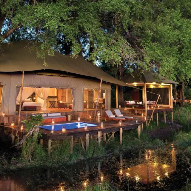 Duba Plains features five beautifully designed tents and the exclusive two-bedroom Duba Plains Suite. Each tent is elevated on reclaimed railway sleepers, offering uninterrupted views of the surrounding floodplains where wildlife, from elephants to lions, roams freely. With private plunge pools, outdoor salas, and en-suite facilities that include both indoor and outdoor showers, every detail is crafted for luxury and immersion.