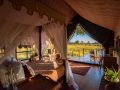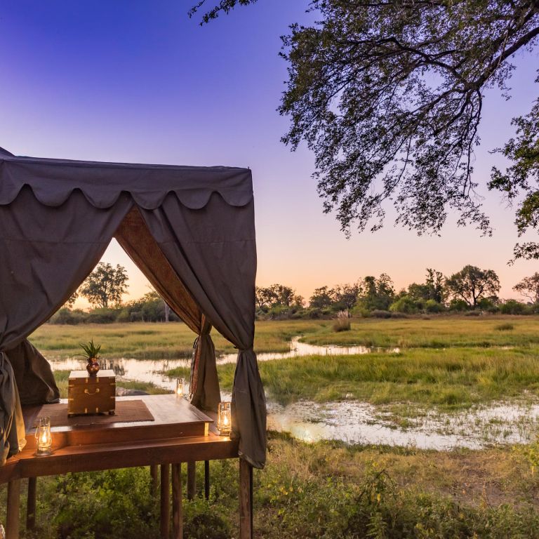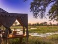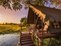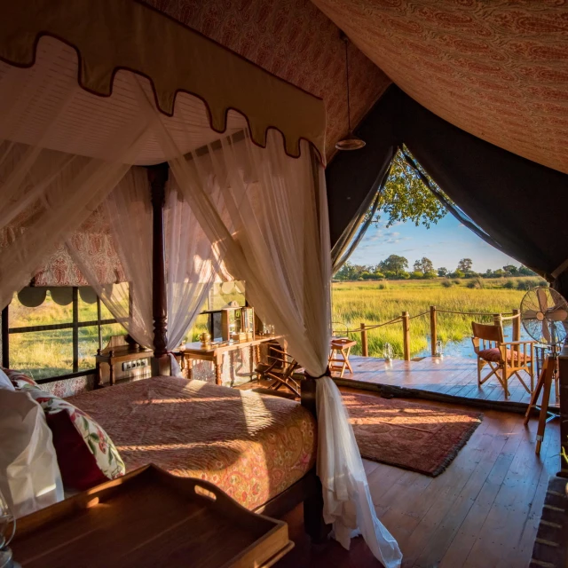 Eight canvas safari suites are adorned with vintage safari furnishings, sumptuous fabrics, Persian carpets, and handcrafted four-poster beds. These suites, perched on raised wooden decks beneath the shade of leadwood and ebony trees, grant breathtaking vistas of the delta's splendour.