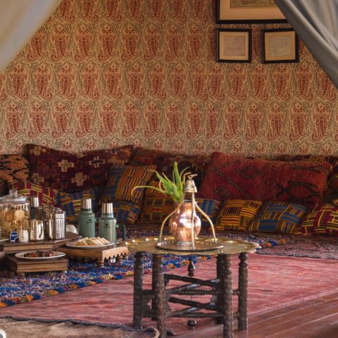 Duke's Camp's communal spaces exude old-world charm reminiscent of its sister property, the famed Jack's Camp. Fitted out with campaign furniture, antique rugs, and cabinets brimming with intriguing mementos. A classic drinks cabinet and lounge area offer respite, while afternoon tea beckons in the elegant Persian tea-tent. A fire pit invites post-dinner storytelling, and a swimming pool offers glimpses of passing wildlife.