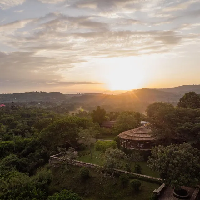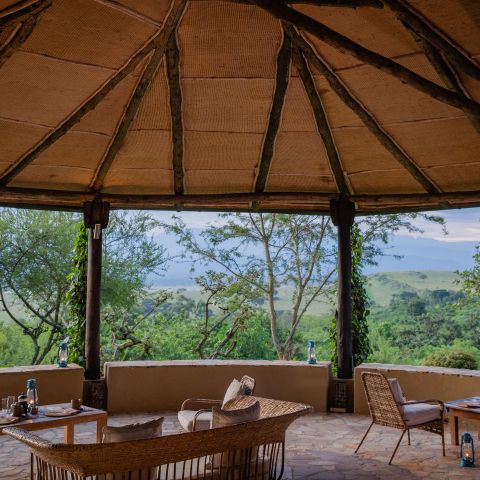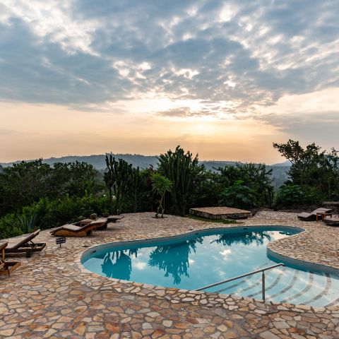 The lodge is located on the edge of Queen Elizabeth National Park with sweeping views of the rolling savanna, the distant mountains of the moon, and the sunken Kyambura Gorge.