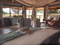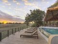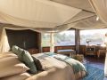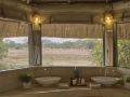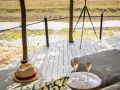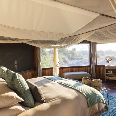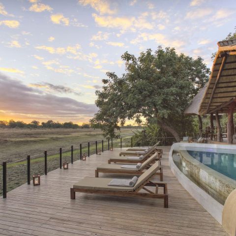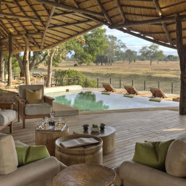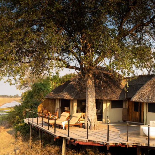 The camp’s ten luxurious timber, canvas, and thatch suites are raised on stilts, with private decks offering panoramic views of the plains and the constant comings and goings of wildlife. The suites are linked to the airy main lodge by a winding wooden walkway, where you’ll find cosy nooks, a pool, and dining areas designed to make the most of the breathtaking surroundings.