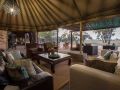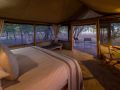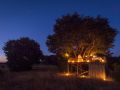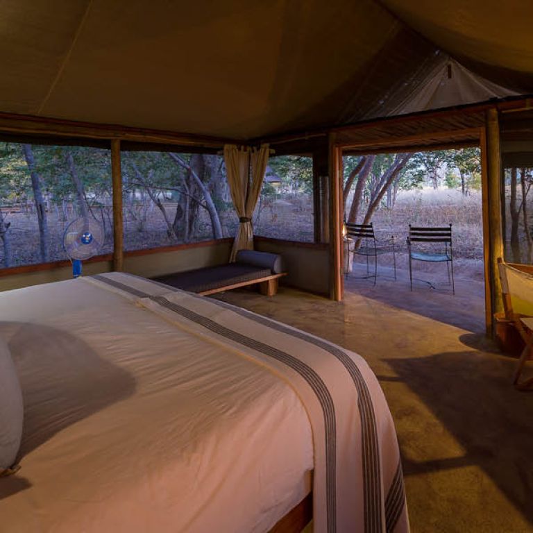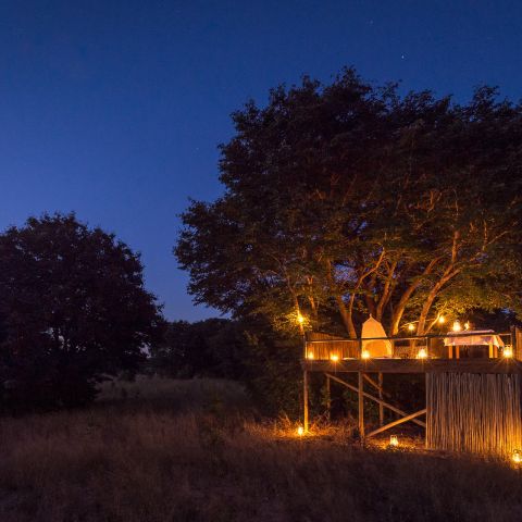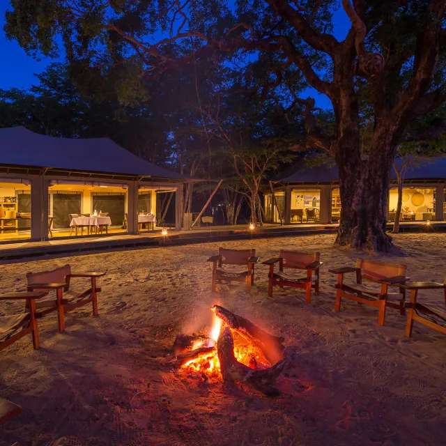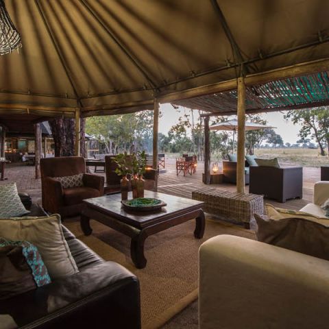 This intimate little camp is nestled in a dappled tree-line. Its six spacious tents (including a family unit), with both indoor and outdoor showers, are connected to the main area by teak walkways, where a towering false mopane tree shades a separate dining and living area with views of the much-frequented waterhole.