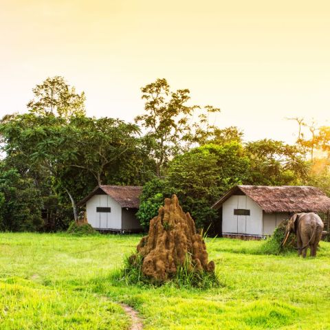 Mboko’s six guest rooms extend along the banks of a free-flowing tributary of the Lekoli River. Situated in an area of lush meadow-like savannah, frequented by forest buffalo, forest elephant and spotted hyaena, Mboko gives a sense of the scale of Odzala while also allowing you to focus on some of the smaller details: flowers and butterflies (depending on the season) can be seen in profusion. Mboko Camp, offers visitors breath-taking views of the interface between the tropical rainforest and grassland savannah where hundreds of towering termite mounds help create an otherworldly experience.