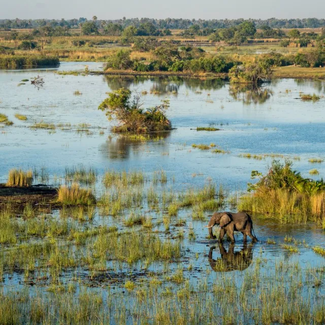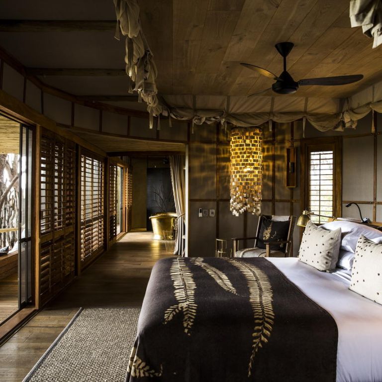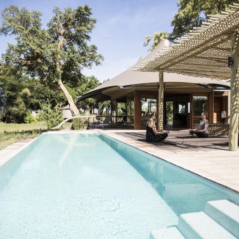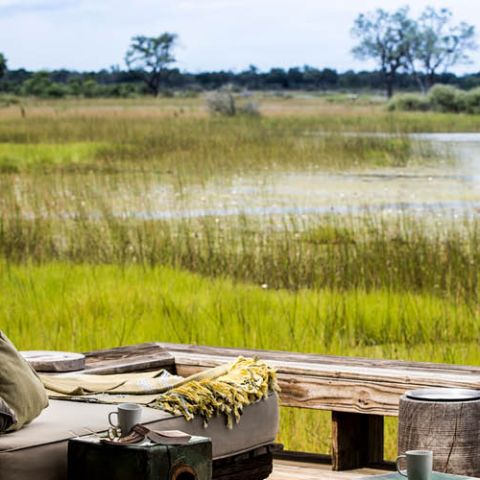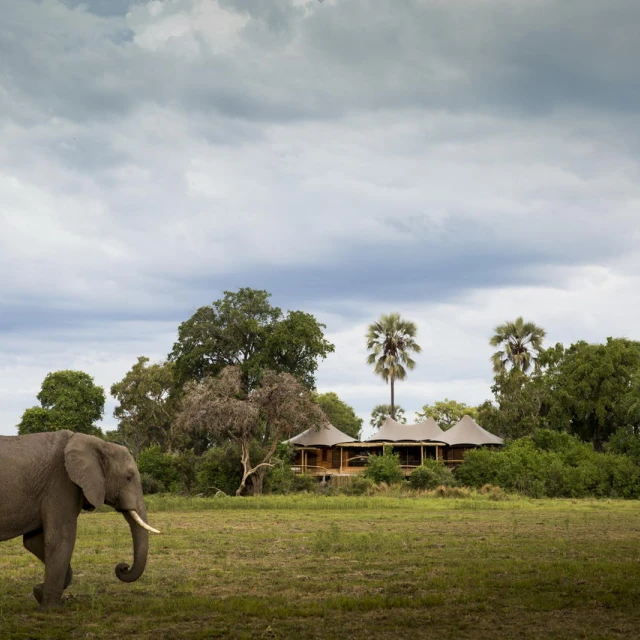 The recently-rebuilt flagship camp maintains the integrity of its pristine environment through the use of natural materials, minimal human footprint and 100% solar status. Elevated on wooden decks beneath towering shade trees, Mombo overlooks a floodplain teeming with game. Elegant, expansive guest tents celebrate Mombo traditions while a large deck and plunge pool are ideal vantage points from which to observe the passing wildlife.