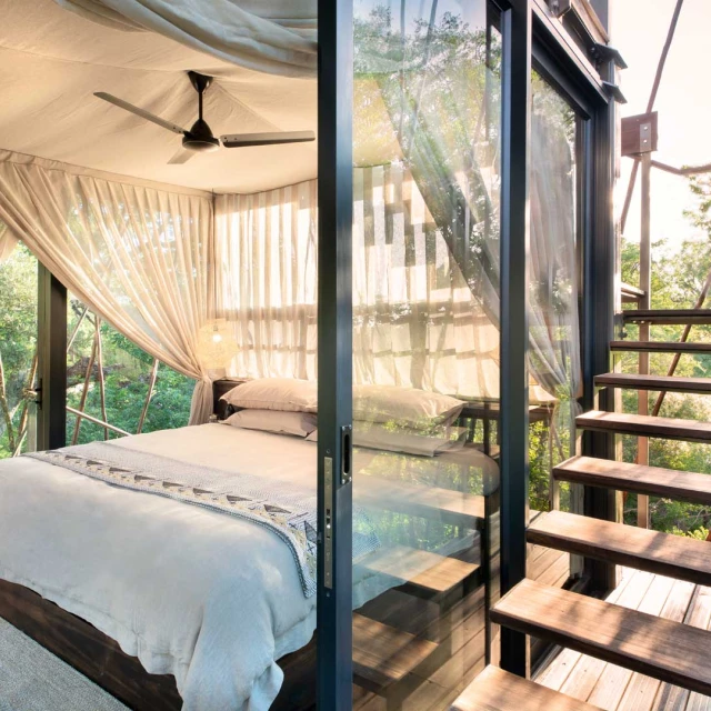 Cocooned in natural bush surrounds, the 4-level treehouse features two sleep areas: level 3 is covered and weatherproof, with a king-size bed, and level 4, a sleep-out platform under a retractable awning. Toast the sunset. Enjoy a starlit picnic dinner. You’re assured of an intimate wilderness experience, completely off the grid, themed in luxury and exclusivity.