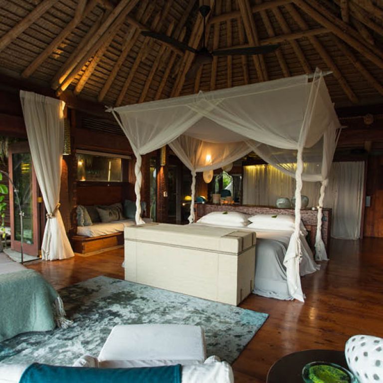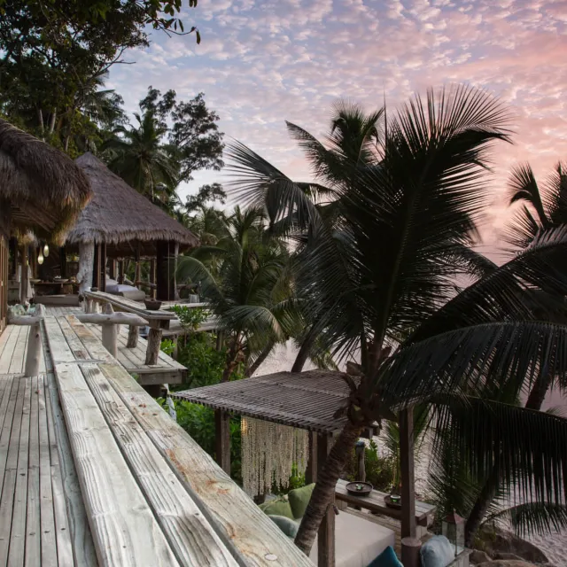 Just 11 individually-handcrafted guest villas on the entire island lie directly on the eastern beach. The Presidential Villas (villas 1 to 10) have a study or second bedroom for children; Villa North Island (Villa 11) is a secluded space for a couple. The scenically-located health spa and gym and rim-flow pool are built into a granitic outcrop, while a sunset bar and restaurant are tucked away on the western beach.