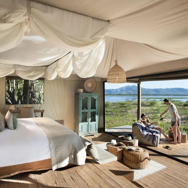 Here, days begin with the call of fish eagles and the gentle lapping of water against the banks, and end under starlit skies, listening to hippos grumble from the river below. The camp runs entirely on solar power, staying true to its commitment to sustainability while delivering a seamless, indulgent safari experience.