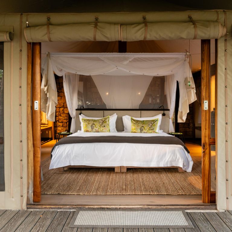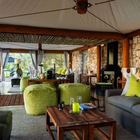 Like the bush where soft air blows against sharp thorns, Onguma Tented Camp is a study in contrasts. Textures such as stone, suede, linen and steel create a setting that is sleek and modern but also inherently of the earth. Inspired by a photograph of an Oryx on Etosha's Fisher's Pan, the interior echoes the colours of its natural surrounds. Grey, charcoal, black, white, and creams, together with a touch of muted or unexpectedly bright green, adds sophistication and earthiness to the atmosphere.
