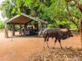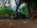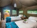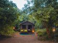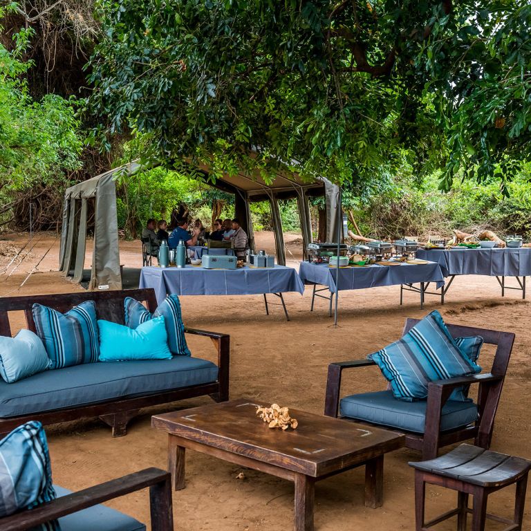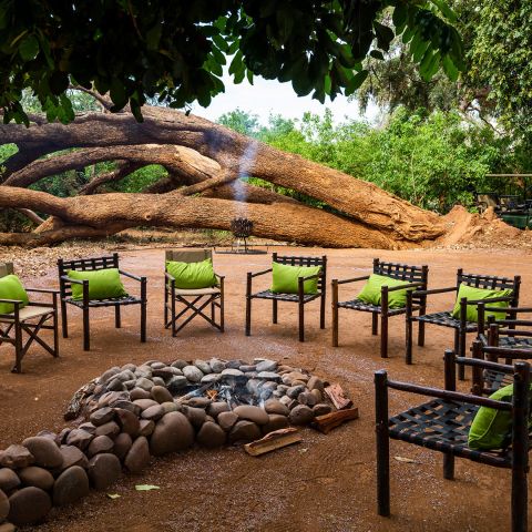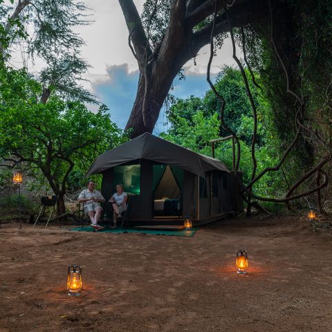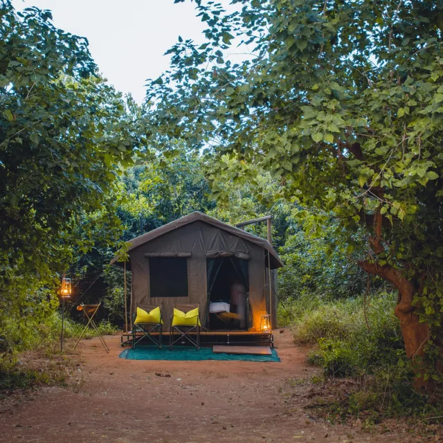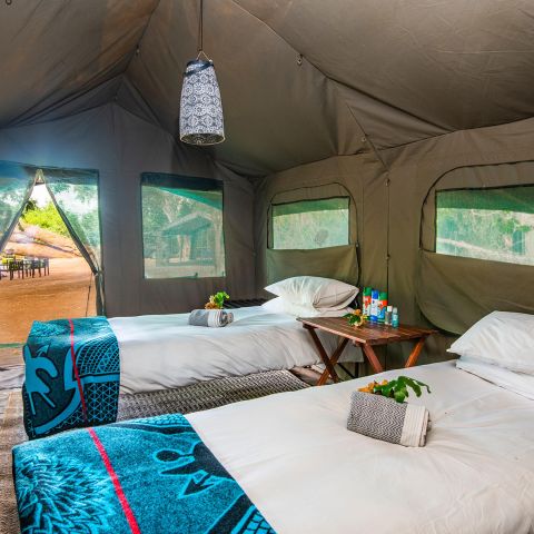 There are just four relatively simple canvas tents with twin beds and simple furnishings, which is all part of the rustic experience. Each tent has an en suite loo, wash basin and bucket shower to the rear and a seating area to the front.