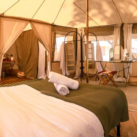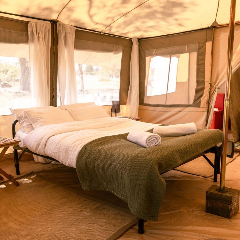 The mess tent encourages relaxation with a well stocked bar, comfortable sofas, games and a library to browse. Outside, deckchairs provide the perfect place to sit back with a cold drink and watch the local wildlife wander by.