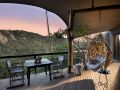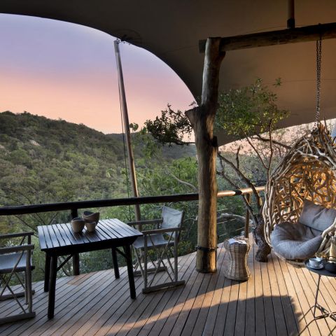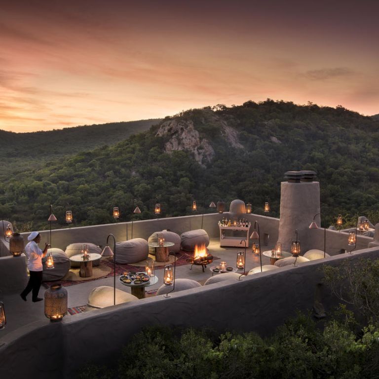 Striking sunsets are witnessed from the game viewing deck suspended over Africa’s bushveld, and delicious Pan African meals are served in the dining area under hand-wrought chandeliers.