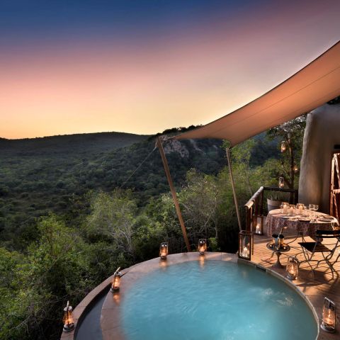 Dramatically set into a cliff-face overlooking spectacular Leopard Rock, the unique Rock Lodge at Phinda Private Game Reserve is an architectural fascination.