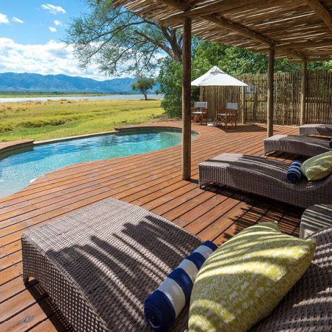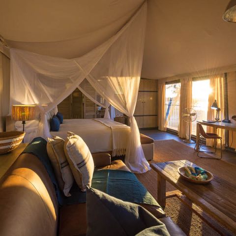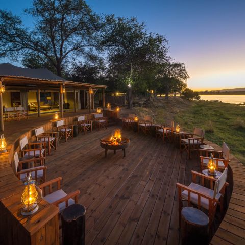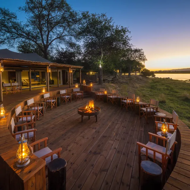 Ten spacious tents (including two family units), along with a generous main space, enjoy the broad vista of the Zambezi River. There is a separate pool area, a unique outdoor “bath with a view” in a secluded, scenic spot, and for the romantic, a Star Bed is located nearby.
