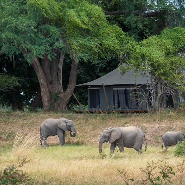 Ruckomechi Camp rises along the banks of the Zambezi River, gazing out towards Zambia’s evocative escarpment. Its broad-canopied ana trees create glorious shade throughout the camp, and are much loved by the elephants for their rich, nutritious seeds. Our concession is explored by vehicle or on foot, while boating and canoeing allow for a different perspective of the area.