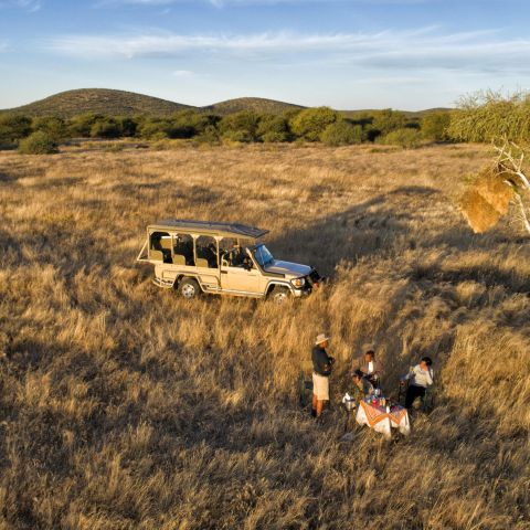Enjoy morning and afternoon game drives in the Etosha Heights Private Reserve, and look for the elusive black and white rhino amongst large concentrations of plains game. Wrap up warm and hop in the vehicle for a night-time game drive to explore the magic of the Namibian bush after dark. Dust off your camera, charge those batteries, and spend the morning or afternoon in the unique, double-tiered photography hide. Even if you’re not a keen photographer, the hide will get you closer than ever to Namibia’s giants. Bush meals and picnics can be arranged with a little advance notice.