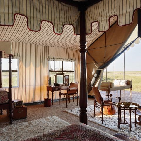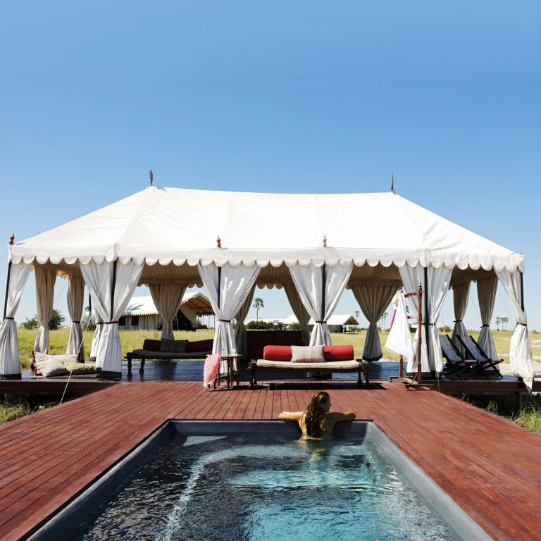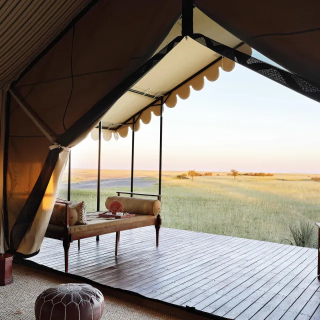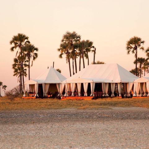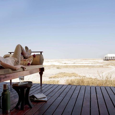 Classic white tents perched on the shore of an enormous sparkling salt pan, each sheltered by a cluster of stately desert palms. Spectacular vistas, soothing and serene - pared down safari elegance with minimal ecological impact, it is the nothingness that attracts.