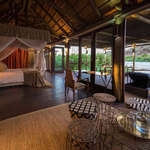 The eight chalets are set on elevated decks and crafted in wood, canvas and thatch to create a unique camp that is at one with its surroundings and celebrates the culture of the Himba people. The Ozonganda (Herero, meaning “main area”) affords spectacular views over the Kunene River.