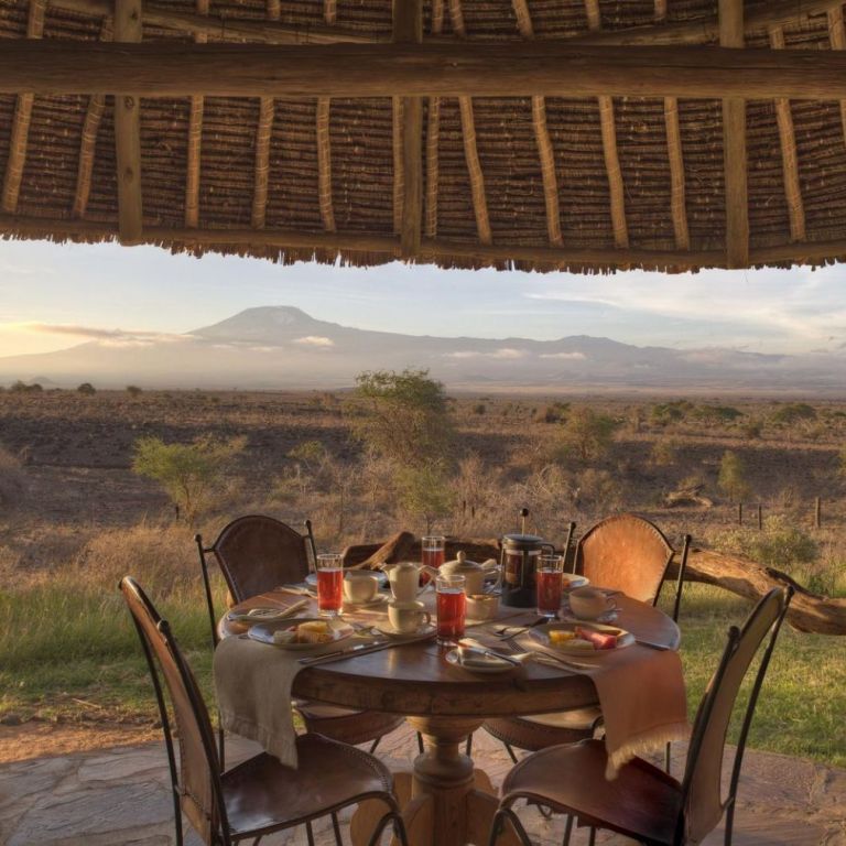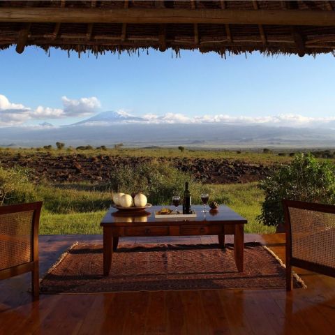 Tortilis Camp is named after the flat-topped, umbrella thorn tree Acacia Tortilis, a sight synonymous with East Africa. It is situated in one of Amboseli's areas of Acacia Tortilis woodland, with the majestic backdrop of Africa's highest mountain, the snow-capped Kilimanjaro. Game drives, walks, sundowners and bush meals are enjoyed both inside the park, and within a private 30,000-acre game where Tortilis Camp is located.
