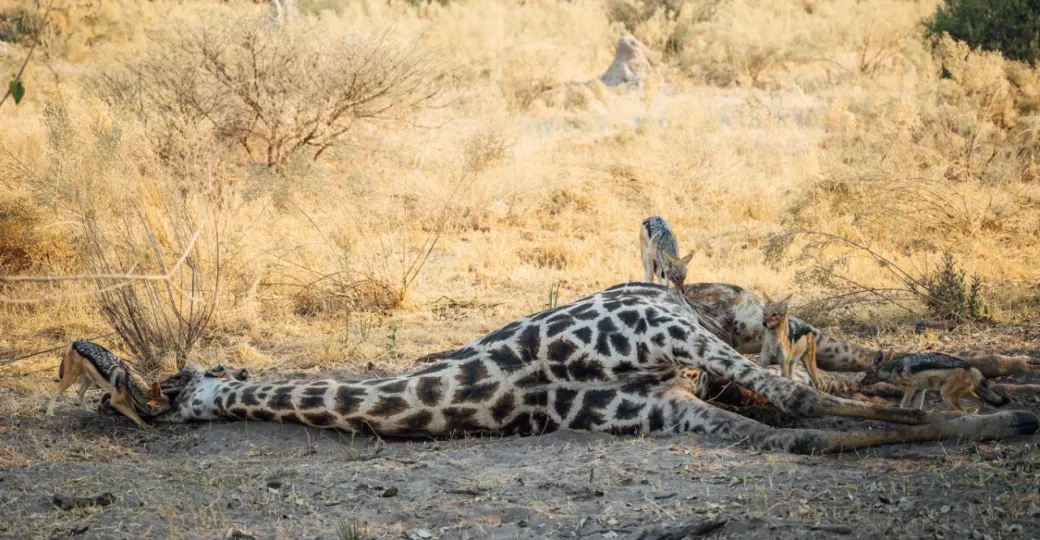 Black-backed jackals sneaking bites of the giraffe. - Toby Pheasant