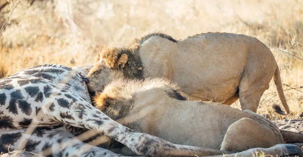 Two male lions really getting in there to feed on a giraffe. - Toby Pheasant