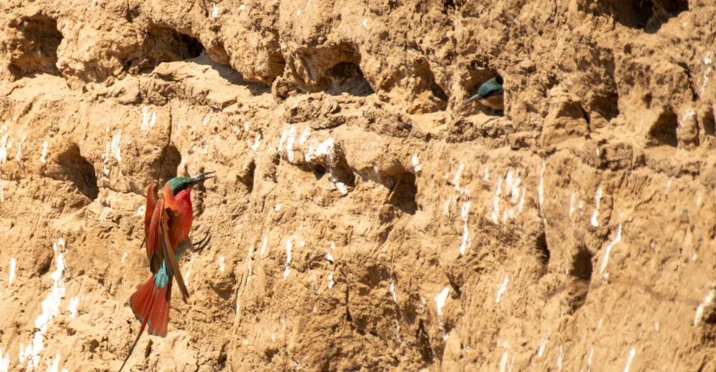 Every year between the months of August and February Carmine bee-eaters return to Zambia and Zimbabwe for their breeding season. Unlike the majority of bee-eaters, the carmine doesn't build a typical nest in a tree, instead they dig out a one metre deep tunnel into the banks of rivers.