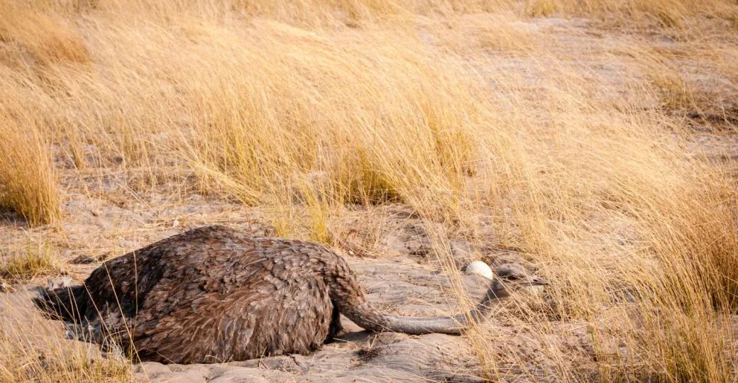 A female ostrich laying low in the Okavango Delta - Toby Pheasant