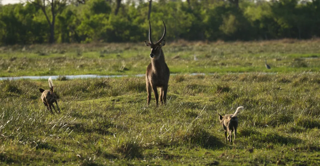A pair of wild dogs making an advance on a waterbuck in Khwai, Botswana - James Handley