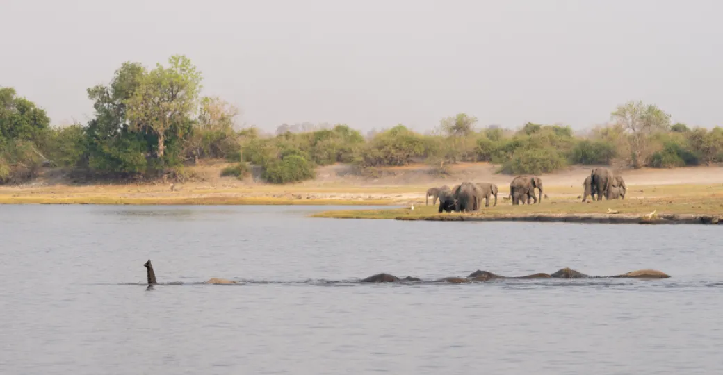 Andrew: Bird life is way more relaxed when you're just drifting past. This creates lovely opportunities to linger and get snapshots of them going about their routine, like bee-eaters swooping in to collect flies hovering above the water. Another great sighting is elephants swimming - all you see is a line of trunks sticking out of the river. It's like something out of a cartoon really.