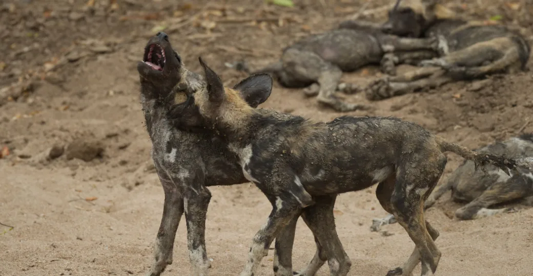 Wild dog pups playing after wallowing in a hippo pool - James Handley